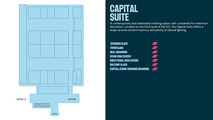 A contemporary and dedicated meeting space, self-contained for maximum discretion. Located on the third level of the ICC, the Capital Suite offers a wrap-around outdoor balcony and plenty of natural lighting.