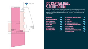 ICC CAPITAL HALL ENTRANCE BANNER ICC TOTEMS ICC TOTEM TOPPERS ICC LEVEL 0 HANGING BANNERS ICC AUDITORIUM ENTRANCE BANNER ICC LIFT BRANDING AUDITORIUM SCREEN EAST REGISTRATION DESK BRANDING CLOAKROOM LEVEL 0